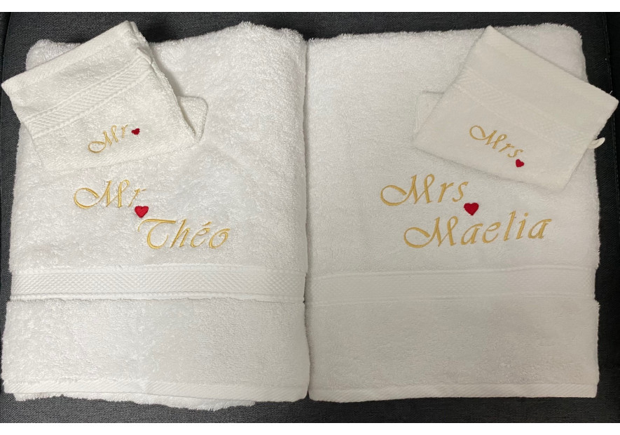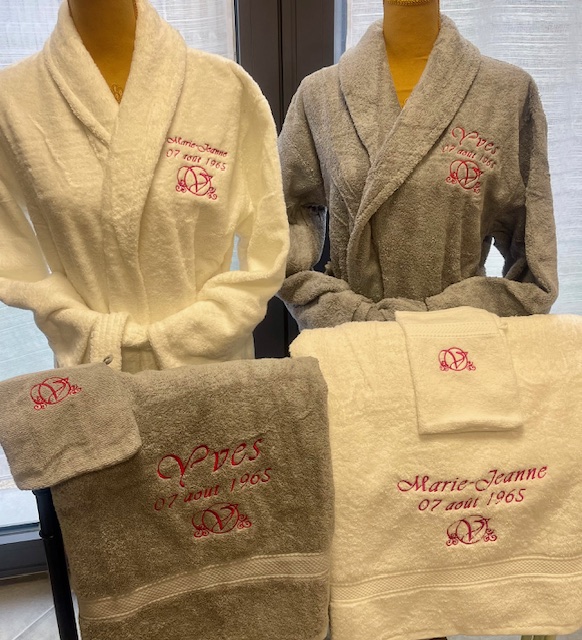 Quel trousseau choisir pour ravir les jeunes mariés ?La confection d'un coffret cadeau de trousseau de toilettes idéal nécessite un choix judicieux des articles. C'est pourquoi La Broderie Bordelaise vous offre un accompagnement attentif pour sélectionner le trousseau qui plaira le plus aux mariés, en fonction de leurs goûts et de leur style. Notre large sélection comprend des serviettes de différentes tailles – du gant de toilette à la serviette de bain, en passant par le drap de douche – toutes disponibles dans une palette de couleurs et de textures pour s'adapter à chaque intérieur. Pour compléter cet ensemble, des peignoirs moelleux et des chaussons douillets peuvent être ajoutés, créant ainsi un ensemble harmonieux et luxueux. Chaque pièce peut être personnalisée avec la broderie choisie, transformant un simple trousseau en un véritable écrin de douceur et d'intimité, parfait pour embellir les moments de détente des jeunes mariés. |