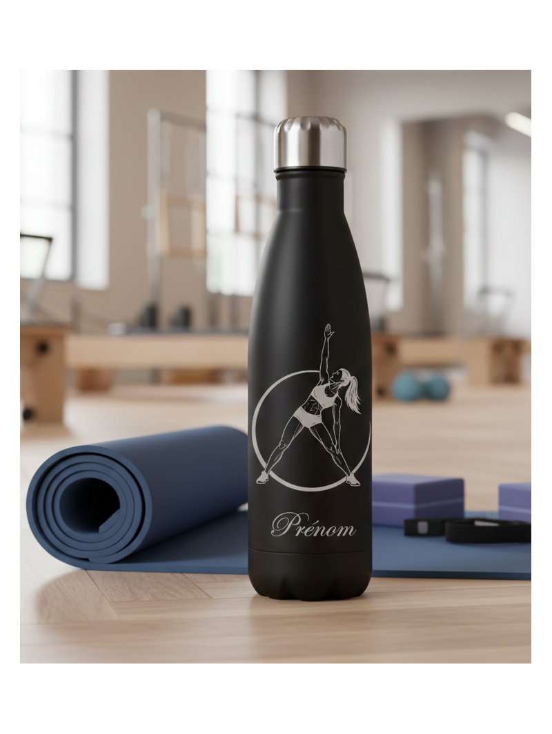 Offrez‑vous une gourde isotherme de 550 ml personnalisée, idéale pour accompagner vos séances de fitness, pilates ou yoga. Son design élégant met en valeur un motif gravé représentant une femme en position de pilates, associé au prénom de votre choix, pour un objet à la fois utile et unique.