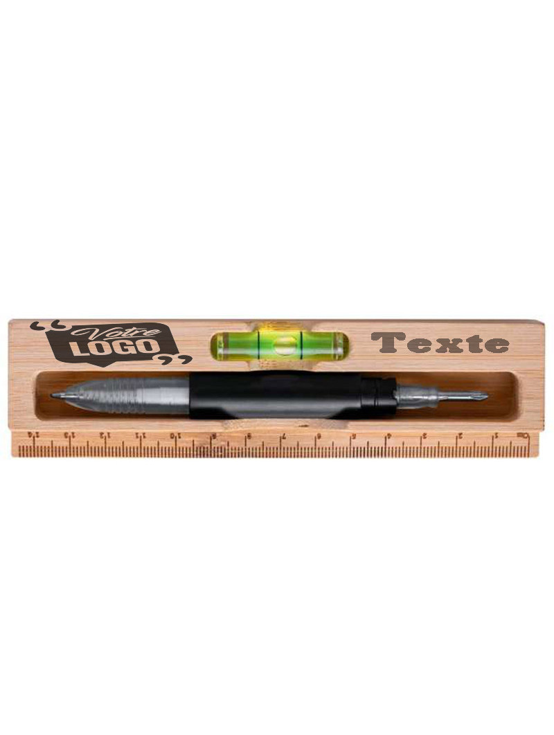 Multi‑outils 5 fonctions intégrant un tournevis plat, un tournevis cruciforme, un stylo à encre bleue avec cartouche jumbo, un niveau intégré et une règle.