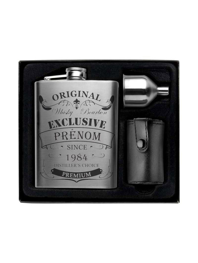 La flasque est personnalisée par une gravure au style “étiquette de bouteille de whisky”, offrant un rendu raffiné et authentique.