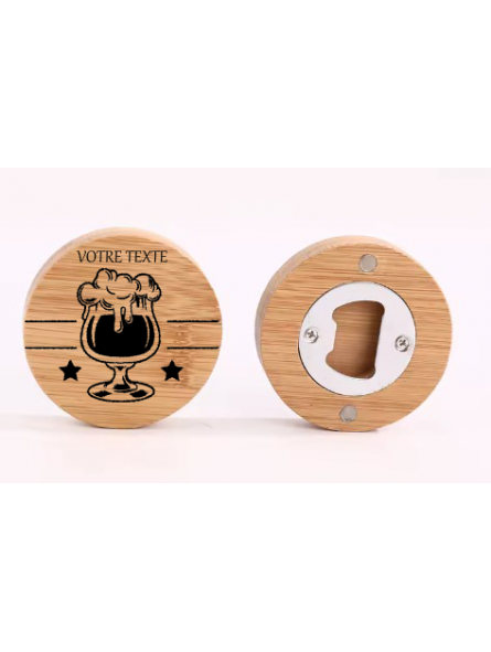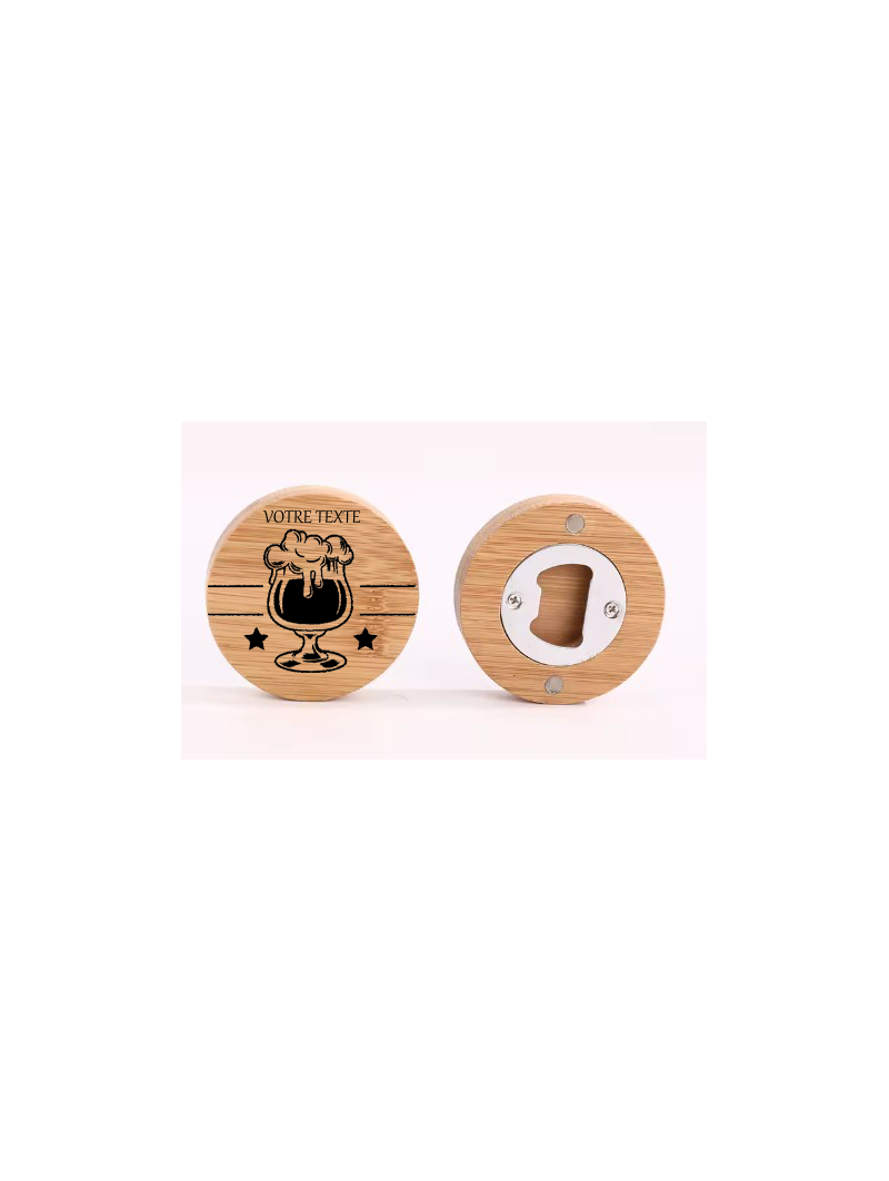 Le bambou naturel apporte une touche chaleureuse et authentique, tandis que la gravure personnalisée sublime le produit. Celle‑ci représente un verre de bière, accompagné d’un texte court, pour un rendu moderne et convivial, parfait pour les moments de partage.
